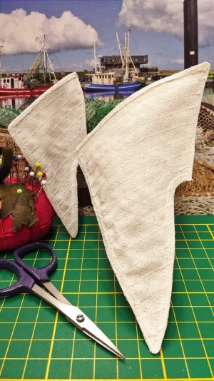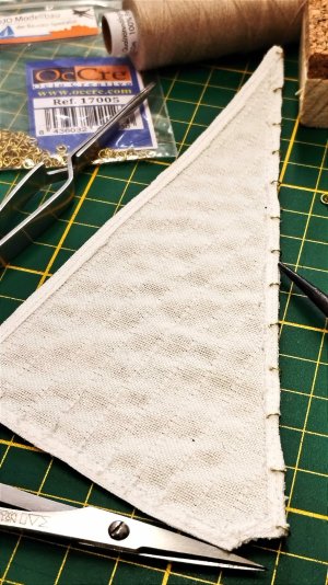 As before I cut meter long strips of Number 320 interfacing fabric 3 mm wide with a hobby knife on my cutting mats against a straight edge. And I glued them to both sides of the edges of my sails with 'Güterman - Creative HT2' textile glue which is thin, fast drying, clear rubber cement. Of course I sewed them down later.