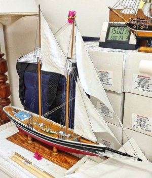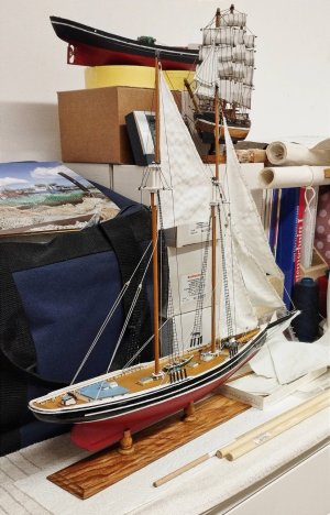 It's a cold, rainy Sunday so a good time to sew more sails since I wasn't satisfied with my main and fore sails so I decided to replace them.