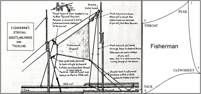 My first set of sails had the gores sewn vertical perpendicular to the mast. This set has the gores sewn in relation to the after edge of the sails which are diagonal or slightly so in the case of the fore sail.