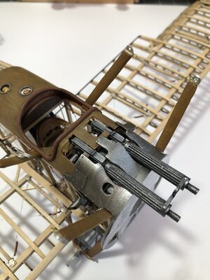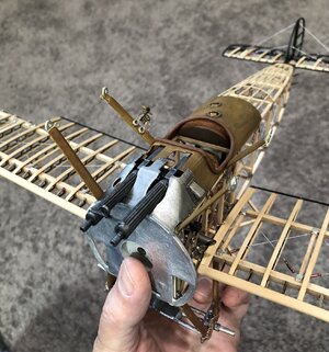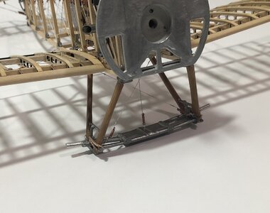 I cleaned up the castings. Since the Brittania metal is soft, I decided to stiffen the struts with strips of wood on both sides. Then I drilled a hole in the wheel shafts, and inserted an aluminum rod. Those things made the entire assembly much more rigid. I now trust it to take the weight of the airplane with motor.