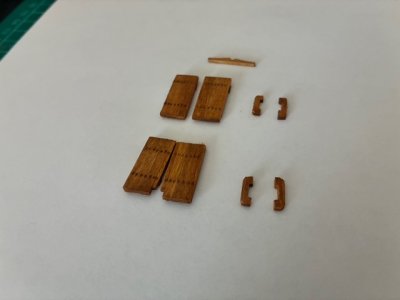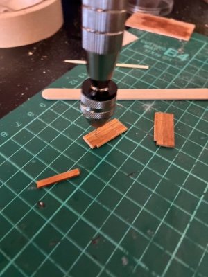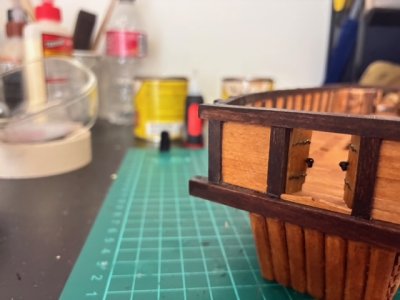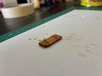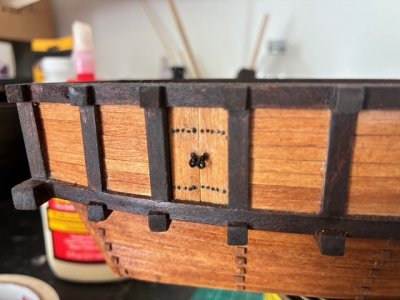 The effect of the holes alone was nearly convincing. But it was from this point my sanity slowly started to crumble. I took the 0.8 mm brass wire I had, but a lot of small strips and fitted them into the wholes. I would then trip down the length a bit and then grind the ends down with the diamond disk of my dremel. The heat of the friction actually helped peen the ends a bit, making them look more like nail heads. After this, I chemically blackened the ends and then CA glue on the backsides to make sure they stained in place. I then made more door rings, and got those into place as well.