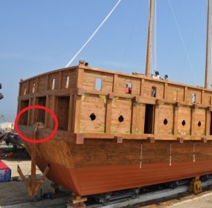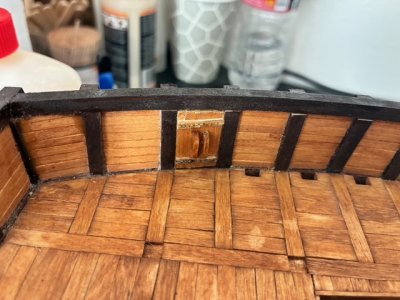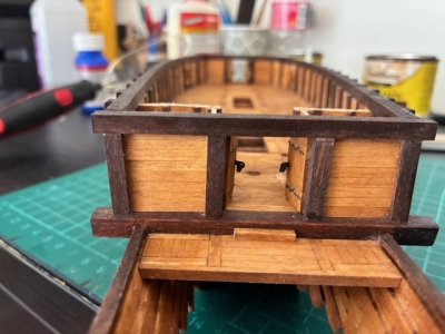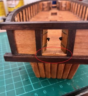 I decided to leave the bow and stern doors open to leave the interior construction partially visable and because the anchor should be hanged out the bow doors. For this reason, I added a fairlead right in front of the bow doors that I've seen pictured on some turtle ships.