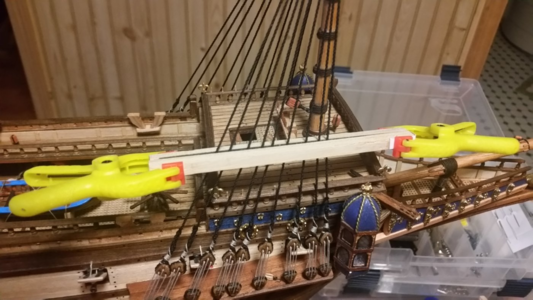 Has anybody tried any other knots than clove hitches for ratlines? I know that's the true replication, but does something else avoid the up and down waviness induced by the hitches at our scales? Or is it all down to stiffening with nail varnish / PVA to get them looking right?Elements & Practice said:RATLINGS are fastened horizontally to the shrouds, at regular distances, from the futtock-staff downwards, and small spars or boat-oars are seized to the shrouds, about five feet asunder, for the men to stand upon. The first ratling to be thirteen inches below the futtock-staff on the lower shrouds. The ratlings are fastened round each shroud with a clove-hitch, except at the ends, which have an eye spliced in and seized round the shroud. Each ratling is placed thirteen inches asunder. The fore and aftermost shroud are left out for the first six ratlings down from the futtock-staff; and like-wise the six lower ratlings next the dead eyes. The topmast-shrouds are rattled in the same manner; the first ratling thirteen inches below the futtock-staff, and rattled throughout. The swifters on the lower shrouds are then removed lower down, half way between the dead-eyes, and bowsed tight, there to remain.