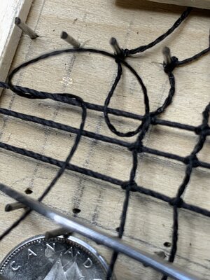 To do this I drew the shrouds and ratlines onto a board and drove small nails in both sides to anchor the ratline and also guide it across the shrouds as shown in this partially completed set of rfatlines. :View attachment 240802
