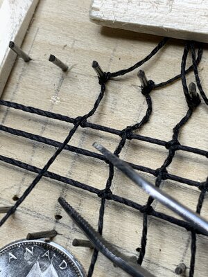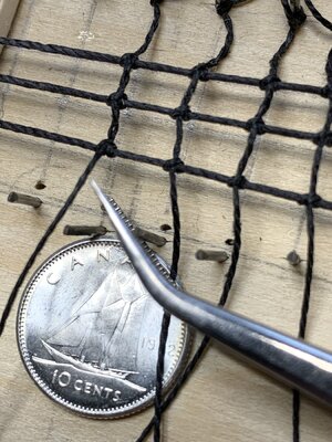 and as you can see to the right side those ratlines for each shroud, using the nails on the ending side or bottom in the view to guide the ratlines across the shrouds which can be adjusted by pushing the knot left or right as needed for alignment and adjusting the tension for the sag that is desired. When done a very small spot of glue with a toothpick secures each knot.View attachment 240805View attachment 240805