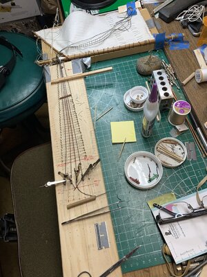 The above was the first time through with the bight served tight at the top before I placed it on the lower mast and behind the crane which was already in place. End result as I have posted over and over was the need to make a second set behind the crane with the mast boom, gaff, and sail bent. Challenge to hold everything in place and not dislodge the work in the cross trees. Second try also was wrong so now a third attempt. When these two fore lowers are done I will add the lower boom connection parts above the table and then either add the top mast and rigging or maybe stay with the much larger sail bent onto the lower main mast while the process is fresh in my mind. You can see the mast/sail secured at the top end of the jig.Adding to the techniques above I will show what I have done for my Bluenose Schooner shrouds and ratlines with is much less complex than those for ships of war or many shrouds. For a secure stable condition I do this flat on my work surface as a vertical condition with the shrouds bent around the mast top would be too flexible for my hands.