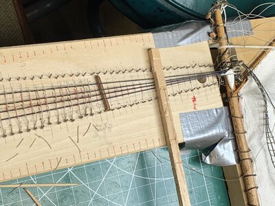 Adding to the techniques above I will show what I have done for my Bluenose Schooner shrouds and ratlines with is much less complex than those for ships of war or many shrouds. For a secure stable condition I do this flat on my work surface as a vertical condition with the shrouds bent around the mast top would be too flexible for my hands.after aboug 10-20 im donde