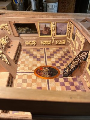 Ivan,Das Treppengeländer aus Eisen ist fertig. Der Vorratsraum vor dem Achtersalon ist auch fertig und jetzt geht die Arbeit im Mittelsalon weiter. Der komplette Boden ist ein sehr aufwändiger Intarsien-Boden. Die Wände sind komplett mit Schnitzereien versehen.